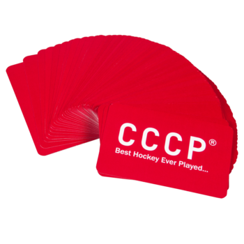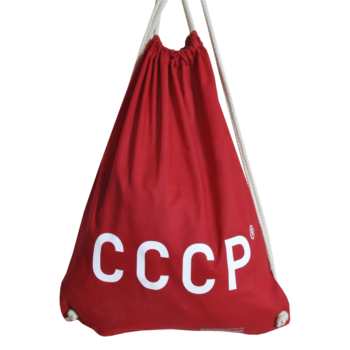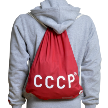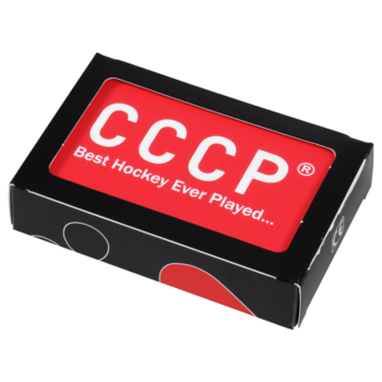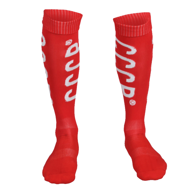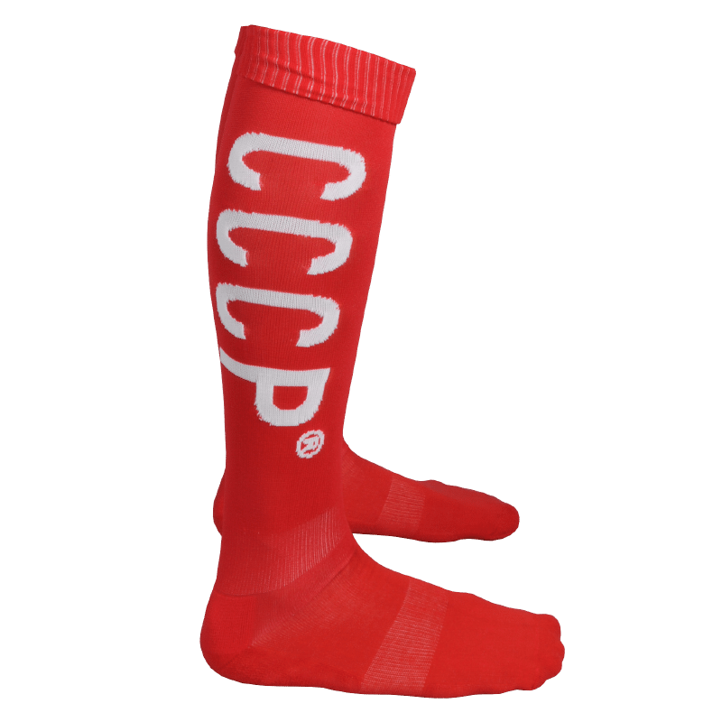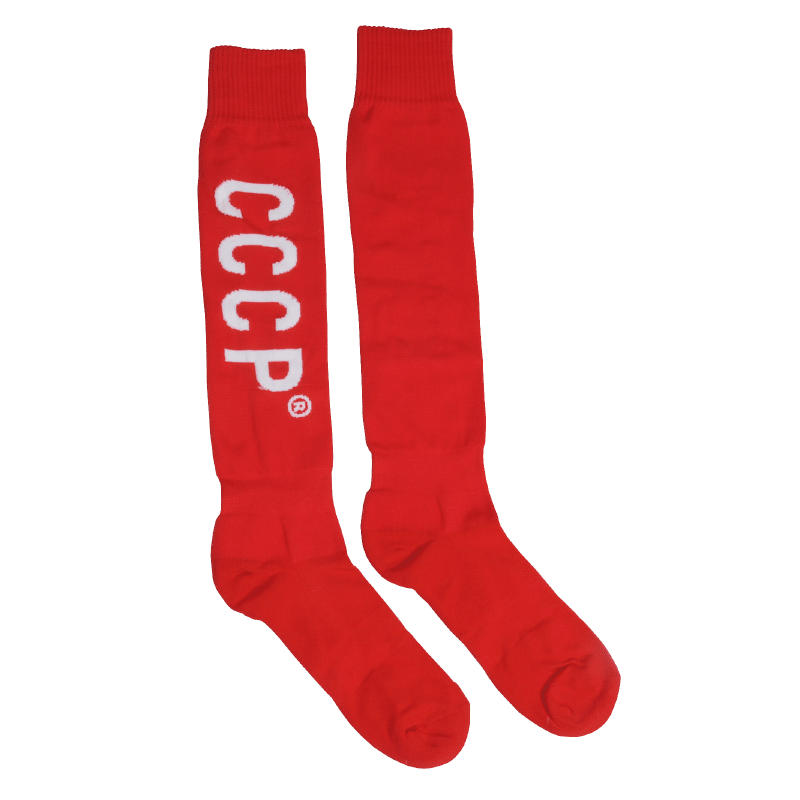 Röda stickade strumpor med instickad CCCP logo på båda strumpor